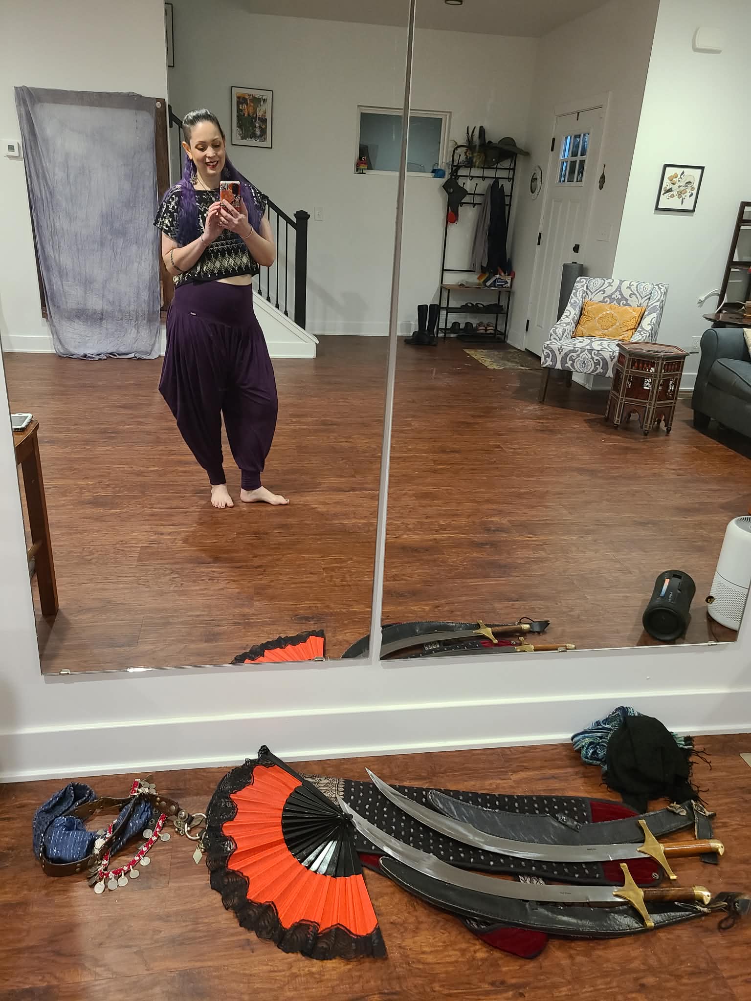 Belly dance instructor Jeana intentionally chose a home with an open floor plan when buying her house in 2023 so she could use her living room as a dance space. She hired someone to mount mirrors on the walls and uses the area almost daily to supplement her studio practice and teaching. Because belly dancing often includes props, it’s important for Jeana to drill them regularly to stay sharp (both figuratively and literally when it comes to sword dancing).
