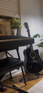When I moved into my apartment last summer, I wanted an area where I could practice music. Worship music has been a major part of my life since I was a newborn (not an exaggeration – I was born on a Saturday and my parents took me to church the following Sunday), and I grew up singing and playing instruments with my dad. Even after leaving the nest, I wanted my home to embody one of the most important aspects of my life: music. I positioned a piano and guitar against my living room window wall and decorated the windowsill with plants, books, scripture, and sheet music from a classic hymn. Now, I use the space to rehearse for the worship team, record songs I learn, play tunes for my friends, and otherwise express my spirituality through music.